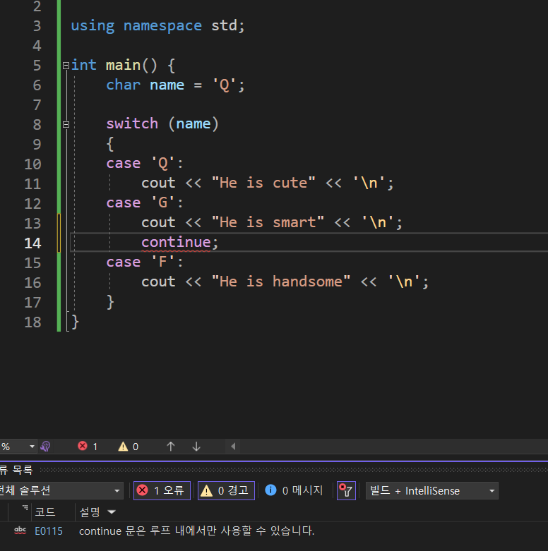 그렇다면 저번 시간에 배운 continue를 사용하면 안 되는지 궁금할 수도 있는데 continue는 루프 내에서만 사용이 가능합니다.