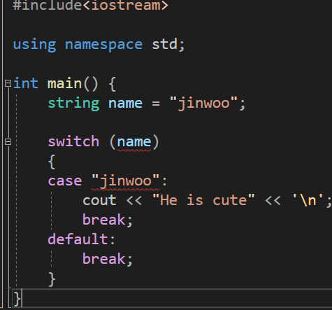 일단 스위치문을 쓸 때 주의해야 될 점은 스위치문 안에 문자열은 들어가지 않고, 문자랑 정수만 들어간다는 것입니다.