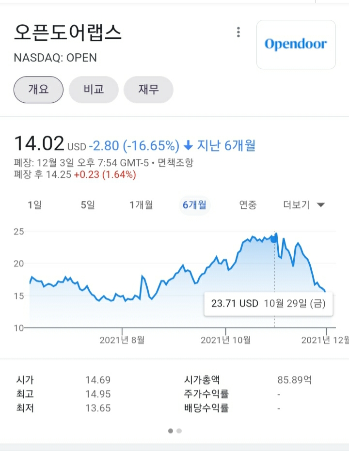 최근 오픈도어가 24불에서 14불까지 내려왔습니다 계속해서 받아주는 물량이 없다보니 지지를 못 받고 낙하하고 있습니다. 이번년도 매출이 5조에서 7조사이로 예상되고 성장률이 분기당 50프로씩일뿐만 아니라 곧 흑자전환하는데 시총 8b??