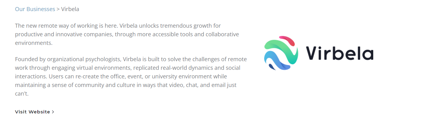 이 밖에 메타버스에도 발을 걸치고 있습니다. virbela라는 플랫폼으로 재택근무하는 사람들이나 학생들을 위해서 가상 사무실을 지원하고 있습니다.