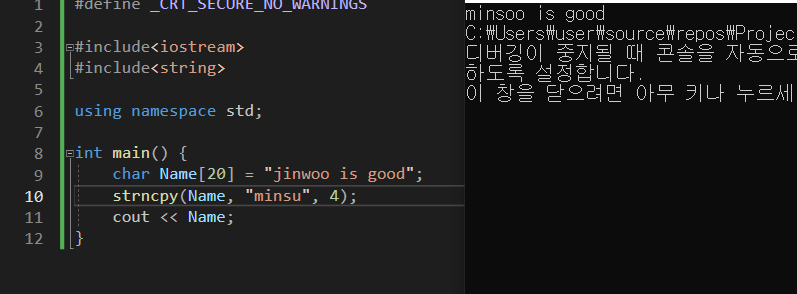 문자열을 복사하다보니 minsu의 앞 4글자 n=mins까지 가져오게 됩니다. 그런데 출력이 될 때 mins가 아니라 minsoo is good이 출력이 됩니다.